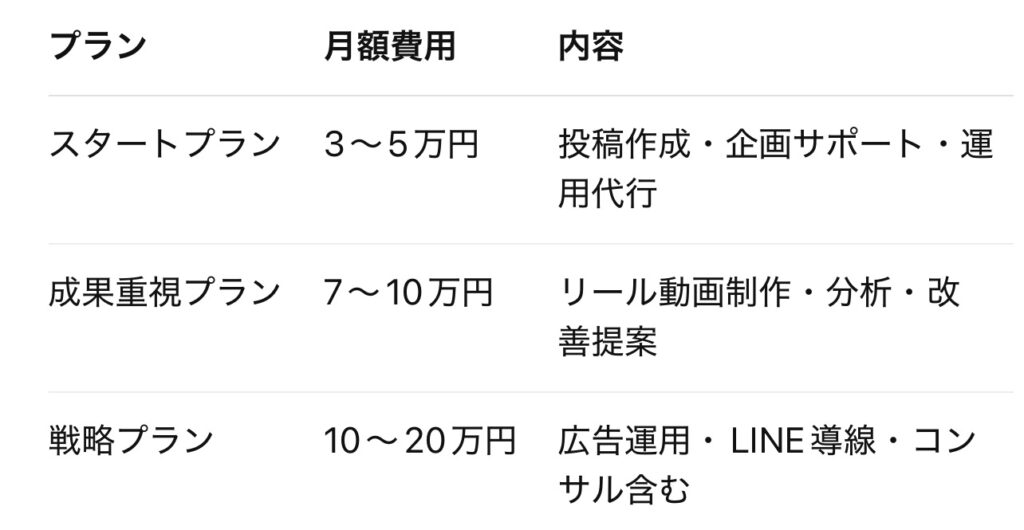 広島エリアでのInstagram運用代行の費用は以下の通りです。